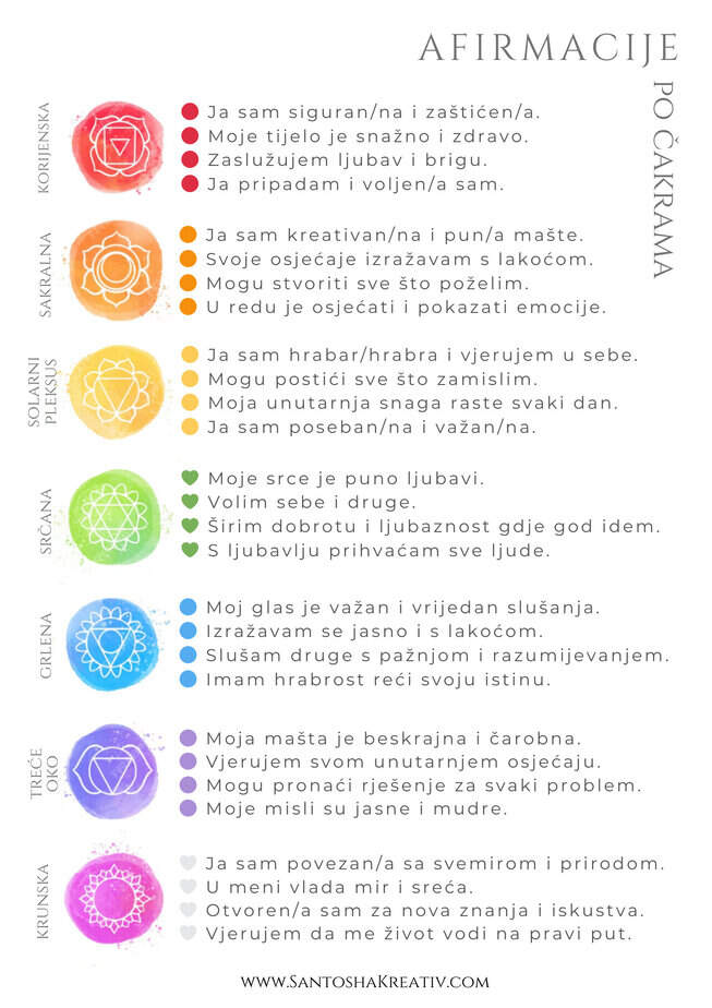 Afirmacije: osmislite afirmacije za svaku čakru i pomozite svom djetetu da ih svakodnevno ponavlja. Na primjer, “Ja sam uzemljen i siguran” za korijensku čakru, “Ja sam kreativan i strastven” za sakralnu čakru, “Ja sam hrabar i vjerujem u sebe” za čakru solarnog pleksusa itd.